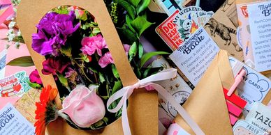 Choose a “Mystery Date” wrapped book — each one carefully selected and labeled with fun, intriguing hints about the story inside (think: tropes, vibes, and different genres). Pick your own pens, teas, hot chocolate, stickers, bookmarks, glasses, masks and more to decorate your book! You won’t know the exact title until you unwrap it at home, making it the perfect cozy companion for your new bouquet.
